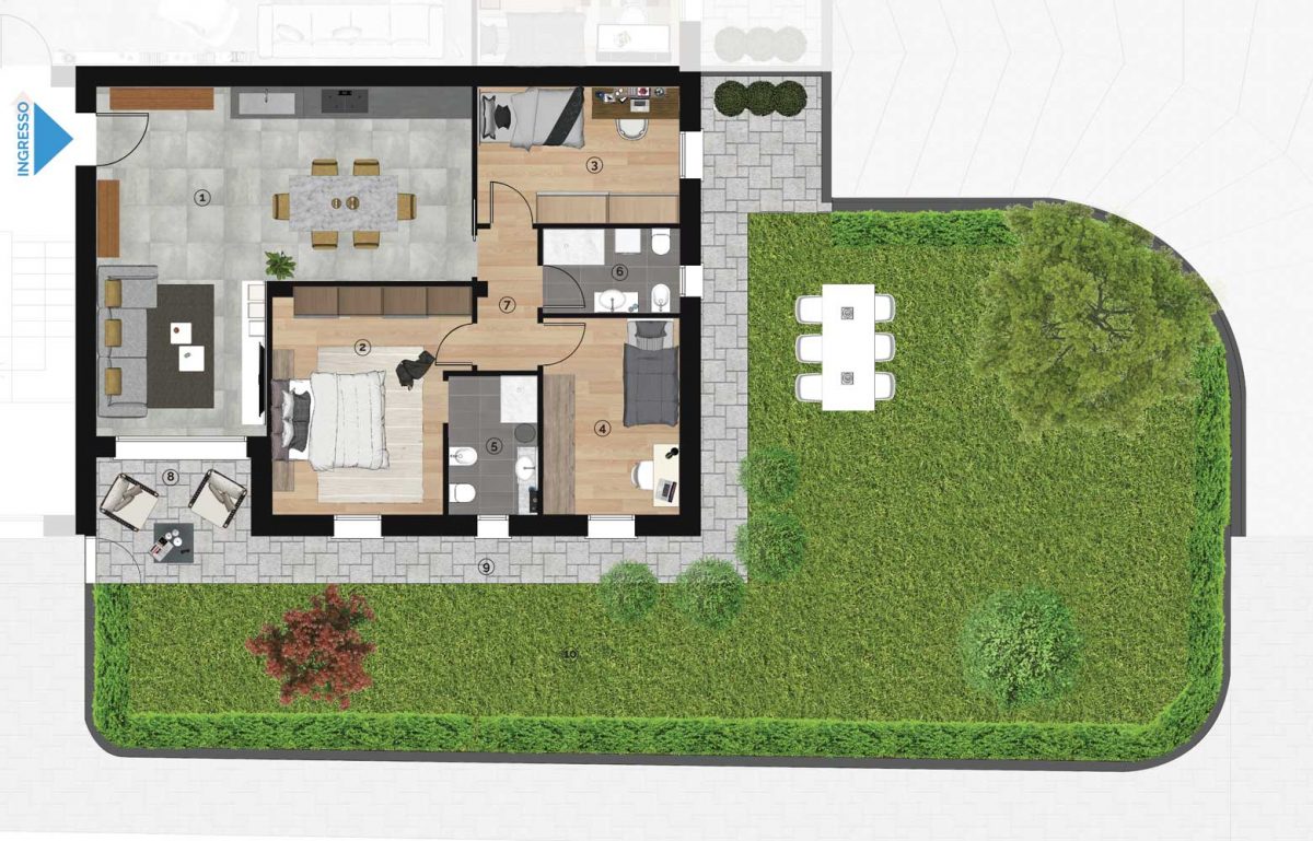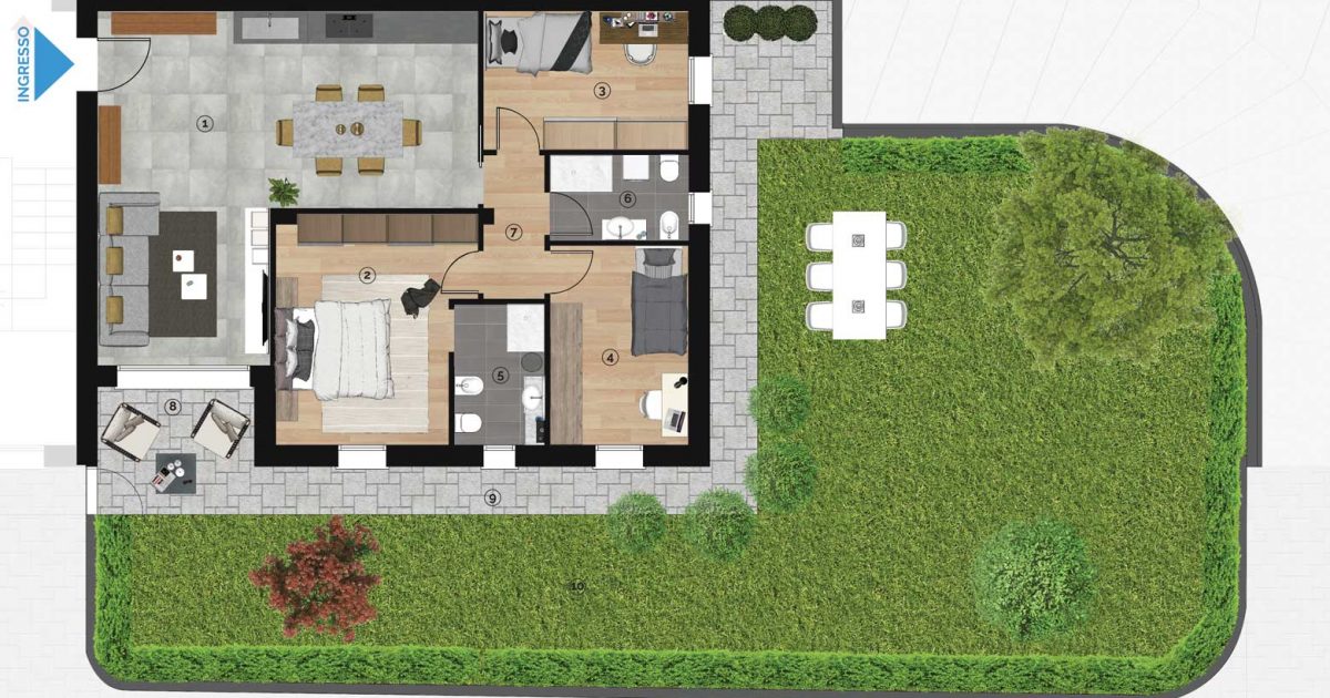 Appartamento composto da ampia zona giorno, tre camere, due bagni, ampio giardino.